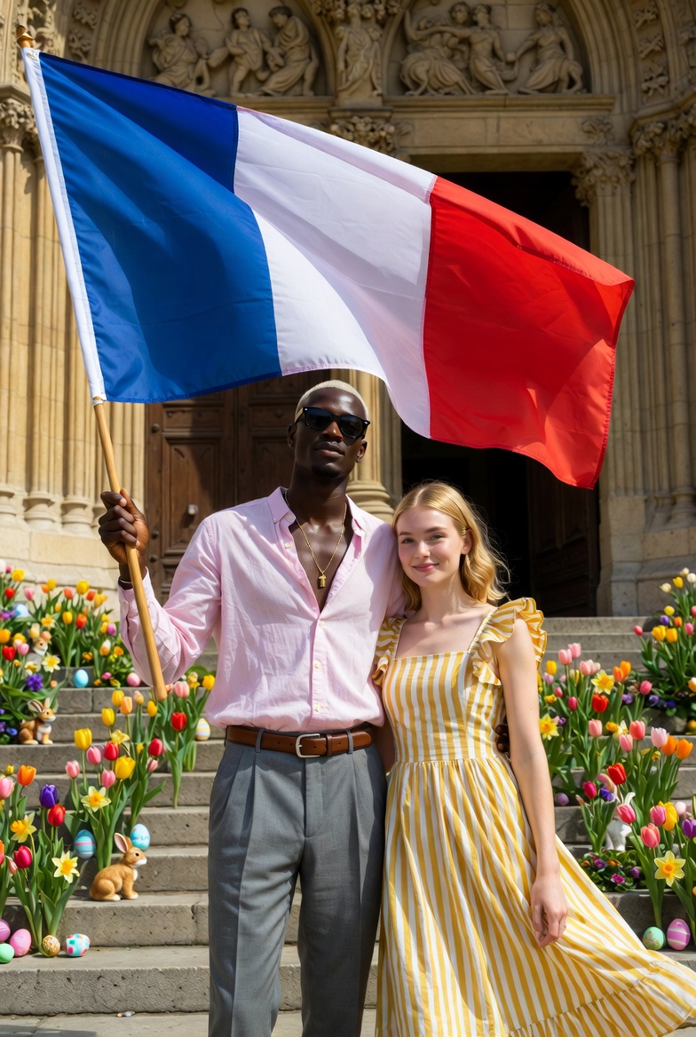 Un plan photoréaliste et en haute résolution d’un couple diversifié se tenant devant l’entrée en pierre ornée d’une cathédrale gothique. À gauche, un homme noir grand et mince, à la tête rasée et portant des lunettes de soleil foncées, vêtu d’une chemise boutonnée rose clair, d’un pantalon gris avec une ceinture en cuir marron, et d’un collier en or, tenant un grand drapeau français (tricolore) qui flotte légèrement. À droite, une jeune femme caucasienne blonde, portant une robe d’été à rayures verticales jaunes et blanches avec des manches à volants, souriant doucement. Ils se tiennent sur des marches en pierre décorées pour Pâques avec de nombreuses tulipes colorées, des jonquilles, des œufs de Pâques peints et de petites figurines de lapins. L’éclairage est une lumière naturelle vive de jour, créant une atmosphère chaleureuse et festive. Prise de vue avec un objectif 35 mm, rendu photoréaliste, éclairage cinématographique, 8K.